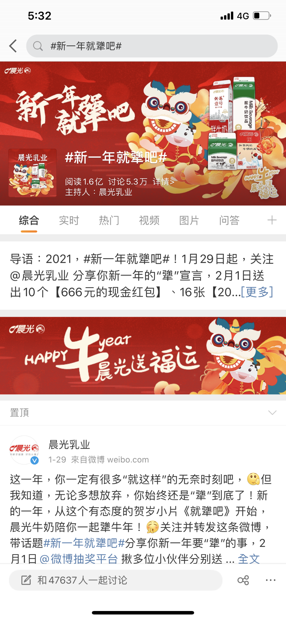 與此同時(shí),@晨光牛奶發(fā)起“犟到底”話題分享抽獎(jiǎng)活動(dòng),以“666元紅包”等“牛氣”獎(jiǎng)品刺激用戶參與話題討論。最終,話題 #新一年就犟吧#登陸微博熱搜榜第6位,僅兩日吸引1.5萬(wàn)人參與討論,話題閱讀量突破1.6億。