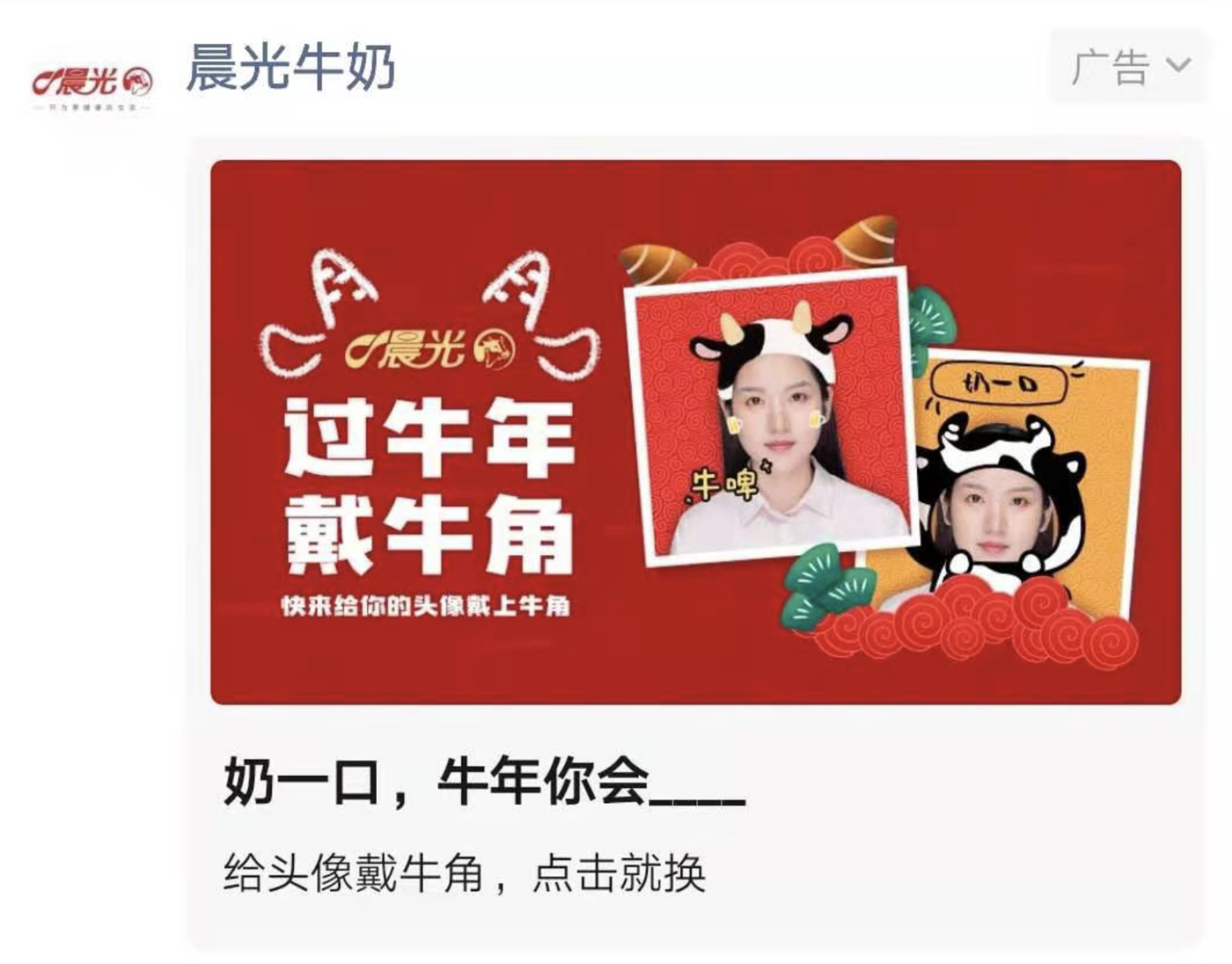 春節(jié),正是各大品牌爭(zhēng)相出招時(shí)刻,如何在一眾營(yíng)銷活動(dòng)中突出重圍吸引用戶關(guān)注?洞察到用戶在春節(jié)期間“換個(gè)喜慶頭像”以及“發(fā)紅包”的強(qiáng)需求,晨光乳業(yè)趣味游戲H5“換個(gè)頭像犟牛年”和“定制紅包”于除夕前上線,邀請(qǐng)用戶為現(xiàn)有微信頭像戴上“牛角”。牛角頭像不僅可以用于微信,也可用于其他社交平臺(tái)。