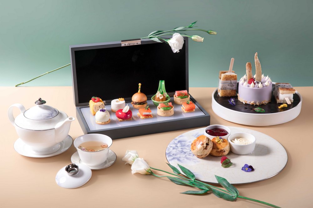 酒店餅房廚師長趙偉融匯創(chuàng)新,選用當(dāng)季新鮮花材與鮮爽水果,打造了數(shù)款意趣多彩的甜品佳作:茉莉百香果椰子蛋糕,茉莉花的清新邂逅酸甜的百香果與香濃的椰子,細(xì)品層疊交融的奇妙滋味;洛神花玫瑰蛋糕,玫瑰的馥郁悠長糅合洛神花的明快艷麗,一口便是春天;青檸春茶蛋糕,別具創(chuàng)意地將青檸和碧螺春茶融合,酸爽口感里裹挾著若隱若無的茶香;桂花米酒蛋糕,當(dāng)桂花飄進(jìn)米酒,花香伴著微醺,細(xì)膩綿柔,在唇齒間琢磨品味;水果“炸彈”,輕輕一敲,冰爽可口的水果傾瀉而出,果香四溢,是視覺和味覺的盛宴。咸點也是不可錯過的味蕾禮賞:肉質(zhì)鮮嫩的蟹肉和清新爽口的牛油果巧妙融合,呈現(xiàn)海陸鮮甜交匯的美妙體驗;細(xì)膩鮮美的三文魚,配上絲滑濃郁的奶油芝士和誘人的魚子醬,是一場舌尖的奢享。隨下午茶搭配的新鮮烘焙司康餅,花香果香四溢的花茶,更增添午后的曼妙意趣。