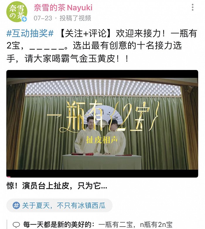 在此之前,奈雪曾用“說相聲”的方式推霸氣金玉黃皮,讓茶飲和相聲組CP;霸氣生椰斑斕上架時(shí),他們出了個(gè)東南亞風(fēng)滿滿的視頻,仿佛一秒到了泰國(guó),創(chuàng)意有趣的同時(shí),也讓消費(fèi)者對(duì)產(chǎn)品留下深刻印象。