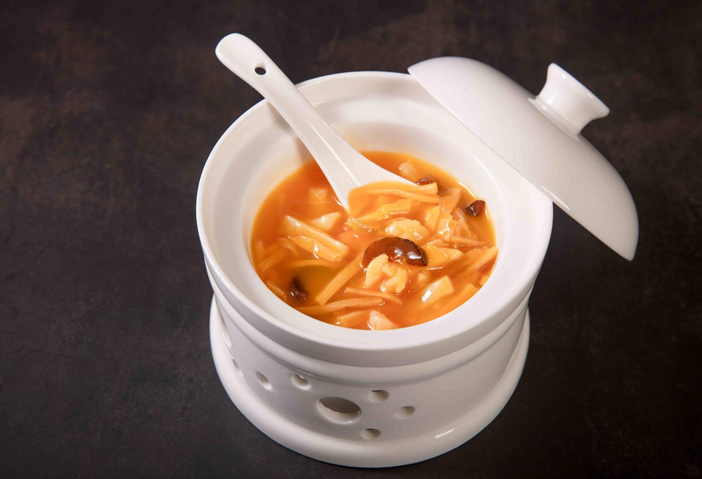 蟹粉?;矢赫邕x多種海洋珍饈,肉厚品佳的海參,軟嫩滑爽的鮮鮑,白如玉簪的白靈菇,在蟹粉濃湯的渲染下,一湯匙入口,滿滿都是精華;