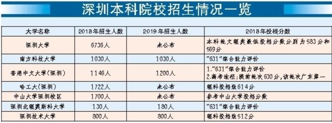在目前已經(jīng)公布今年招生計(jì)劃的深圳高校中,深圳技術(shù)大學(xué)于2017年、2018年分別依托深圳大學(xué)招收226名及807名全日制本科生;2018年11月30日,深圳技術(shù)大學(xué)獲教育部發(fā)函正式成立,于2019年進(jìn)行首年獨(dú)立招生。記者從該校獲悉,深圳技術(shù)大學(xué)今年的招生數(shù)量與去年基本持平,計(jì)劃招收6個(gè)專業(yè)11個(gè)方向的800名新生。2019年,香港中文大學(xué)(深圳)預(yù)計(jì)在全國(guó)26個(gè)省市(自治區(qū))共招收本科生1200人,相比去年稍有增加。南科大也表示,今年計(jì)劃招收本科生1030人,與2018年的招生人數(shù)相差無(wú)幾。深圳北理莫斯科大學(xué)今年將啟用永久校區(qū),招生人數(shù)從去年的130人擴(kuò)大到了180人。