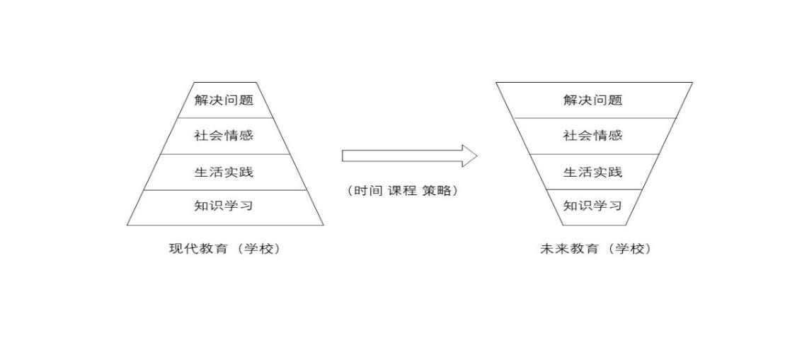 如果說未來教育要超越現(xiàn)代教育,必須把四個層次的權重倒置過來,如圖所示,即從時間、課程和策略上做根本性的認識和改變。