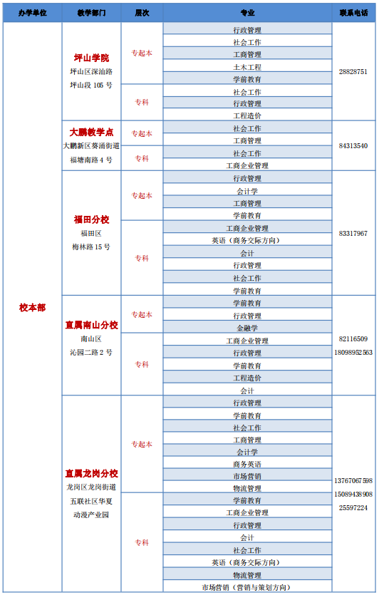 深圳開放大學(xué)2021年春季招生教學(xué)點與專業(yè)公示