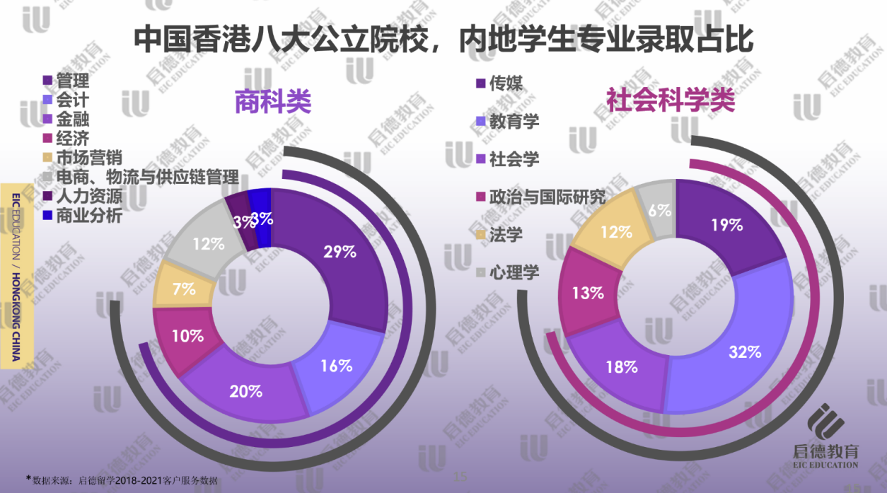 啟德留學2018-2021客戶服務數(shù)據(jù)顯示,香港高校商科方向的錄取學生比例占絕對優(yōu)勢(39% ),社會科學類專業(yè)居次 (30% ),由于粵港澳地區(qū)高科技產(chǎn)業(yè)就業(yè)機會多,港校科研實力強勁,工程技術類專業(yè)錄取占比 (17% )也較為可觀。在商科的細分專業(yè)中,管理專業(yè)是首選(29% ),這與港校各種管理類專業(yè)選擇較多且錄取難度相對偏低有一定的關聯(lián)性。金融(20% )、會計(16% )和經(jīng)濟學(10% )專業(yè)注重培養(yǎng)學生的思維以及分析能力,多被授予理學碩士學位,畢業(yè)生在香港地區(qū)很受歡迎。背景一般,特別是來不及準備GMAT的申請人,可以嘗試申請經(jīng)濟學,增加入讀港校商科核心專業(yè)的機率。受內(nèi)地電商及周邊行業(yè)的快速發(fā)展的影響,電商、物流與供應鏈管理類(12% )成為近年新晉的熱門專業(yè)。