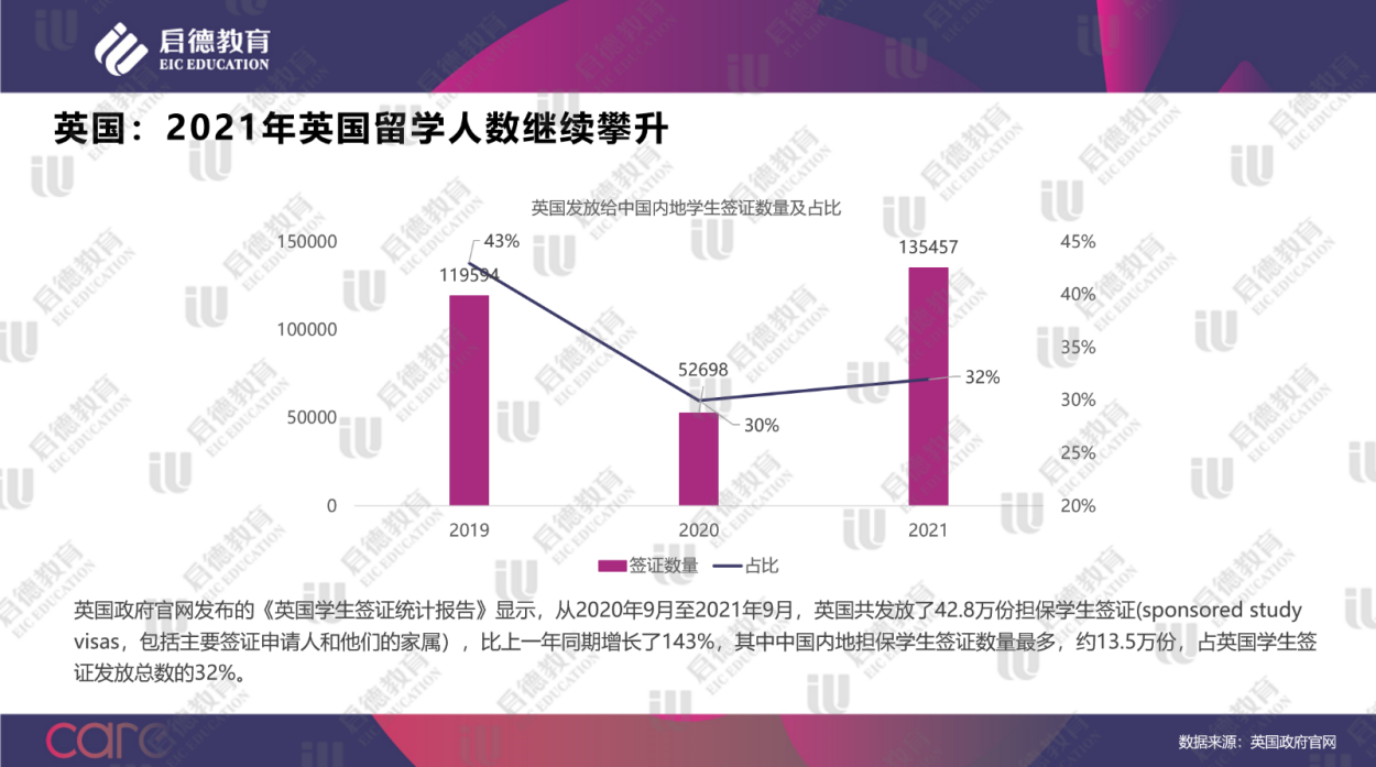 英國政府官網(wǎng)發(fā)布的《英國學(xué)生簽證統(tǒng)計報告》顯示,從2020年9月至2021年9月,英國共發(fā)放了42.8萬份擔(dān)保學(xué)生簽證(sponsored study visas,包括主要簽證申請人和他們的家屬),比上一年同期增長了143%,其中中國內(nèi)地?fù)?dān)保學(xué)生簽證數(shù)量最多,約13.5萬份,占英國學(xué)生簽證發(fā)放總數(shù)的32%。