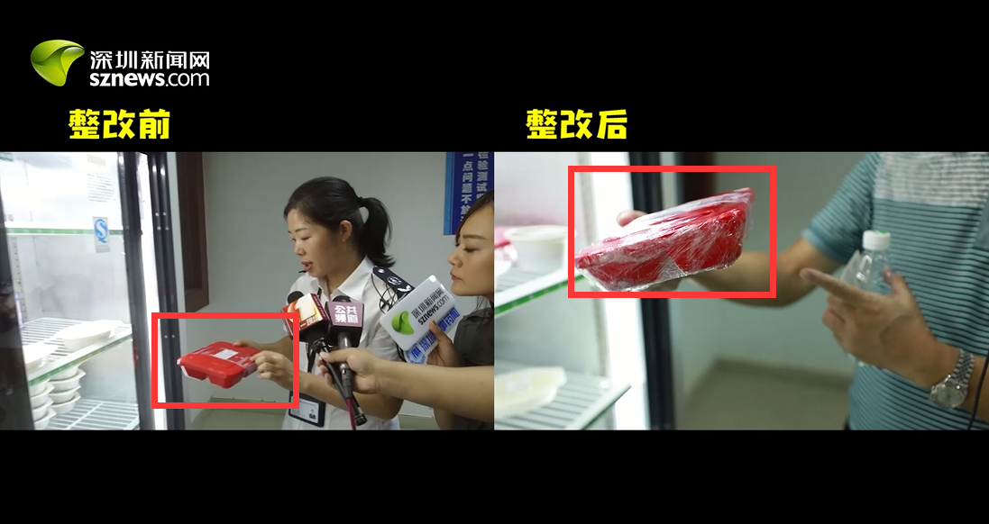 29日突查發(fā)現(xiàn),該公司留樣柜“留樣食品有漏汁”。今日深圳新聞網(wǎng)回訪(fǎng)發(fā)現(xiàn),該問(wèn)題已得到整改,留樣食品已用保鮮膜密封。