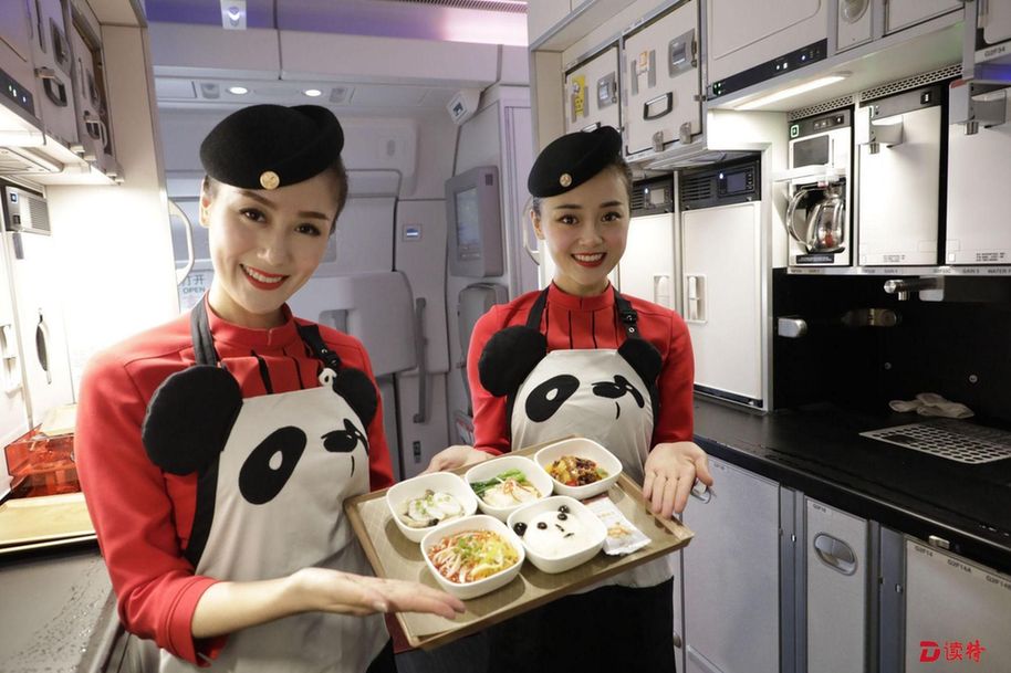 除了色彩繽紛的熊貓彩繪之外,機艙內(nèi)的熊貓元素隨處可見,仿佛把大熊貓基地搬上了天。