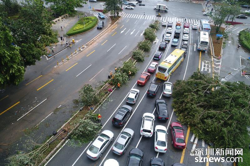 10點(diǎn)11分,蓮花路新洲路口,有工作人員正在清理道路中伏倒的樹木