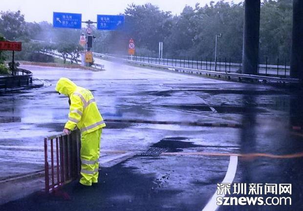 邊檢民警冒雨在強臺風中固定好引導分流鐵馬