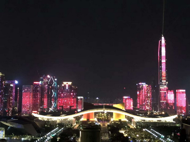 這臺別開生面的晚會,主舞臺設在市民中心廣場,舞臺后方呈現(xiàn)著深圳市精心打造的福田中心區(qū)43座樓宇燈光秀,五彩斑斕、綺麗多姿的深圳城市新夜景,與晚會現(xiàn)場舞臺融為一體,為市民和廣大觀眾呈現(xiàn)出一個迷人的“深圳之夜”。