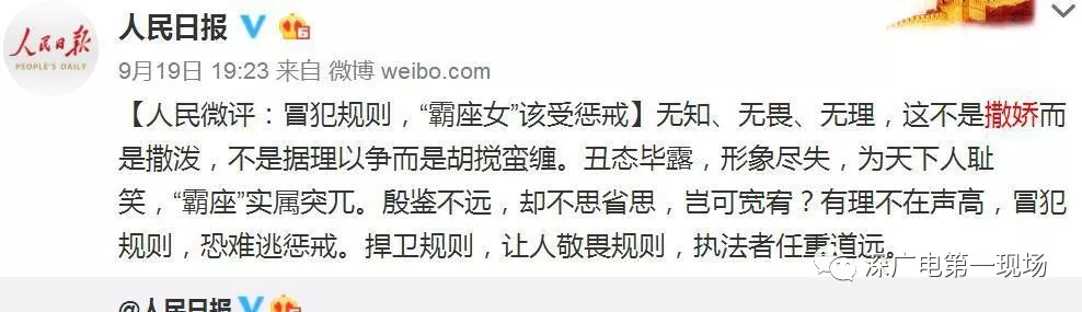 對(duì)此,@人民日?qǐng)?bào)官方微博昨晚發(fā)表評(píng)論【冒犯規(guī)則,“霸座女”該受懲戒】:無(wú)知、無(wú)畏、無(wú)理,這不是撒嬌而是撒潑,不是據(jù)理以爭(zhēng)而是胡攪蠻纏。丑態(tài)畢露,形象盡失,為天下人恥笑,“霸座”實(shí)屬突兀。殷鑒不遠(yuǎn),卻不思省思,豈可寬宥?有理不在聲高,冒犯規(guī)則,恐難逃懲戒。捍衛(wèi)規(guī)則,讓人敬畏規(guī)則,執(zhí)法者任重道遠(yuǎn)。