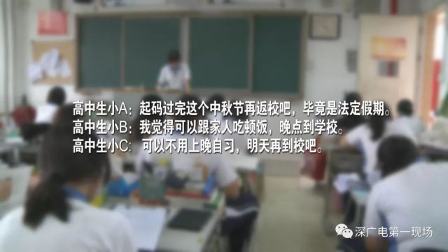 今天,深圳市高級(jí)中學(xué)、深圳市福田中學(xué)、沙井中學(xué)、東方英文書院的一些高中學(xué)生,通過(guò)在線留言等多種方式,向欄目反映,中秋節(jié)是法定假日,但他們卻沒(méi)法和家人一起吃飯團(tuán)聚,更別提賞月看晚會(huì)了,原因是學(xué)校要求寄宿的學(xué)生今天晚上要提早返校,參加晚自習(xí)或者考試。