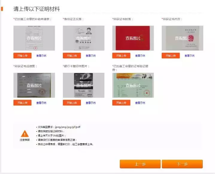 3.進入證明資料上傳頁面,將準(zhǔn)備好的資料進行上傳,全部上傳完后,點擊【下一步完成提交】;