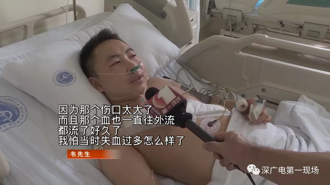 經(jīng)過(guò)急救,傷者韋先生已被轉(zhuǎn)往胸外科接受治療。韋先生說(shuō),昨天晚上因?yàn)榈秱朐旱目刹恢顾粋€(gè)人。