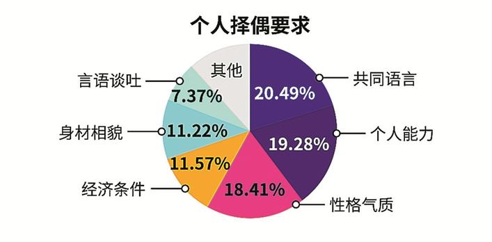 調(diào)查顯示,共同語言、個人能力、性格氣質(zhì)為單身男女在擇偶時最看重的三個方面,其次為經(jīng)濟條件、身材相貌、言語談吐??梢姡噍^于過去條件上的匹配,更重視精神上的契合。