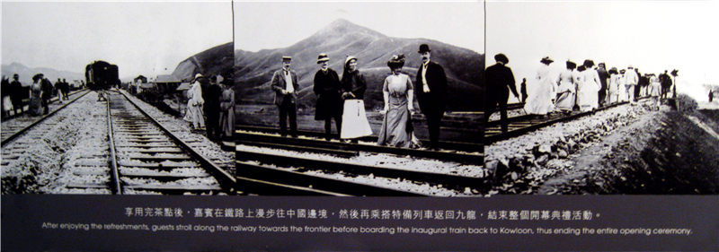 左邊第一張圖為1911年10月15日九廣鐵路全線通車現(xiàn)場,右邊兩張圖為參加通車典禮的中英嘉賓的活動場景