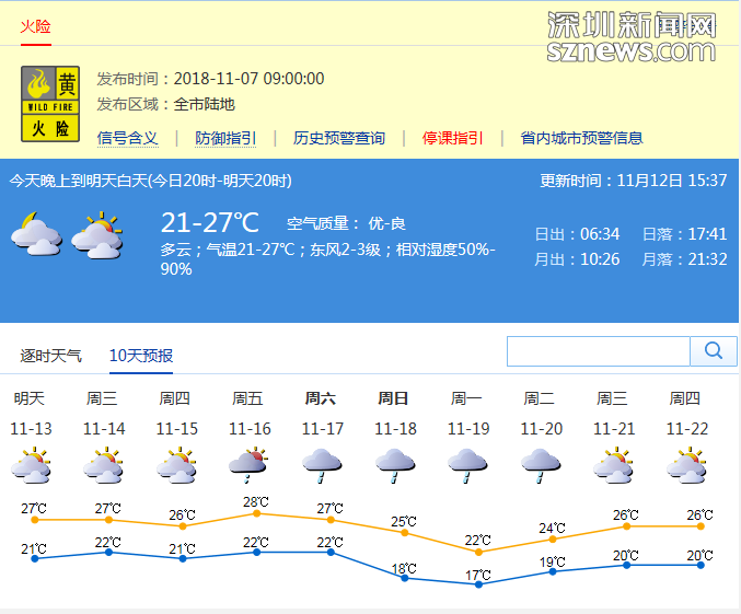 記者從深圳市氣象局了解到,11日夜間到12日白天,深圳市多云間陰天;早晨最低氣溫22-23℃,東部及山地地區(qū)氣溫會(huì)低1-2℃;白天最高氣溫在28-30℃;相對(duì)濕度在45%-95%;偏北風(fēng)2-3級(jí),沿海和高地最大陣風(fēng)4-5級(jí);全市能見度普遍在5-15公里左右?;痣U(xiǎn)預(yù)警信號(hào)生效中。