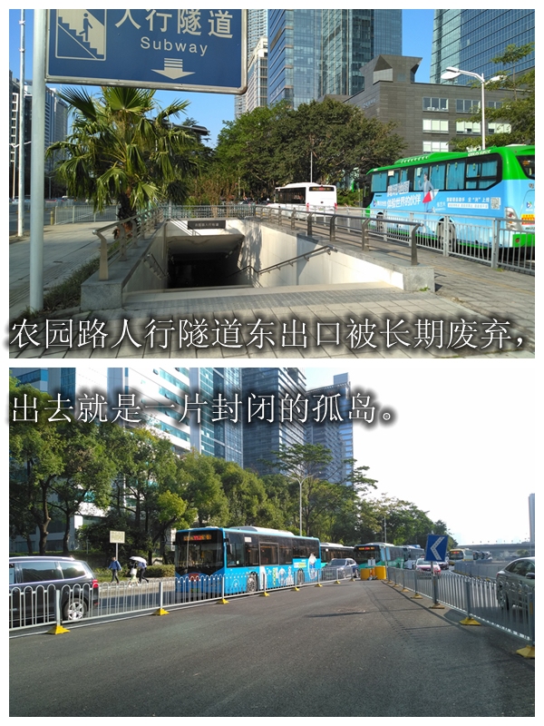 自2017年連通深南大道兩側(cè),可供行人通行的人行天橋被拆卸后,行人都只能從人行隧道過街。但奇怪的是,人行隧道的東出口處是一片被隔離、被荒廢的“孤島”,這讓需要從此出口通行的市民很尷尬。即使避開這個(gè)出口,選擇繞行,又容易在農(nóng)園路口與右轉(zhuǎn)車輛發(fā)生沖突?!罢娴暮転殡y我們啊?!笔忻駞窍壬C實(shí)了步行通過該路段的“艱難”。