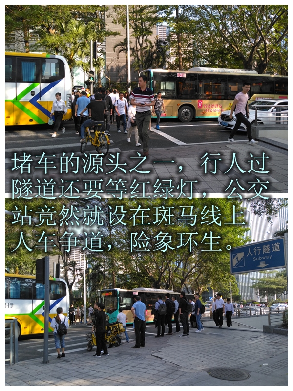而在進(jìn)入人行隧道前,又需要等紅綠燈,且公交車站就設(shè)在這紅綠燈前的斑馬線上?!拔也幻靼诪楹卧诮煌ㄟ@樣混亂的地方,要設(shè)置公交車站,也不知為何‘為難’的都是市民?!本W(wǎng)友“深圳大胡子”為這里每天通行的行人鳴不平,他希望能把招商銀行公交站原來的港灣式站臺恢復(fù),方便市民乘車,也希望能盡快恢復(fù)正常的過街通道。