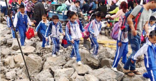 成群的學(xué)生在碎石上走過,旁邊小道擠滿三輪、電動單車(網(wǎng)友“伊戈達拉”供圖)