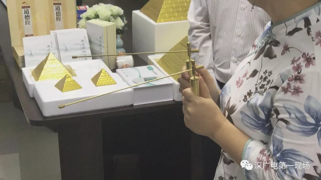 一開始,就上來了一位叫許姐的團(tuán)隊負(fù)責(zé)人,但她并沒有著急介紹主角“萬能金字塔”,而是不慌不忙地賣弄起另一樣所謂的“神器”——尋龍尺。