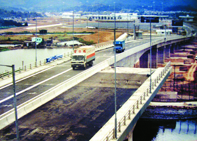 1989年12月26日,皇崗口岸開(kāi)通時(shí)的第一輛入境貨柜車(chē),當(dāng)時(shí)落馬洲大橋只建成一半。 黃國(guó)春 攝