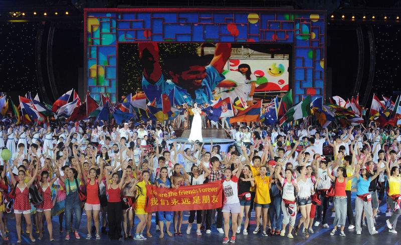 2011年8月23日,第26屆世界大學(xué)生夏季運(yùn)動會閉幕式在深圳舉行。這是閉幕式上打出的“我們永遠(yuǎn)是朋友”的橫幅。