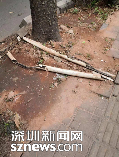 據(jù)網(wǎng)友“syq123”在論壇帖子上發(fā)帖稱,在地鐵3號線大芬站A2出口北行、中翠路與龍崗大道交口東南側(cè)人行道綠化帶上,埋在地下的線管破裂,電線裸露在外,十分危險。同時提到電線旁邊倒下的大樹已經(jīng)扶正,但是電線依舊沒有進行修理。