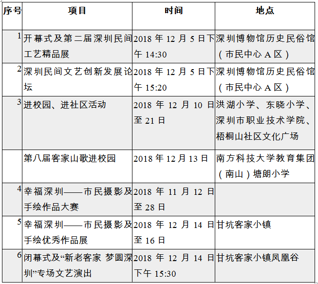 2018年12月10日至21日,將在洪湖小學(xué)、東曉小學(xué)、深圳市職業(yè)技術(shù)學(xué)院、梧桐山社區(qū)文化廣場舉辦4場進(jìn)校園、進(jìn)社區(qū)活動(dòng),組織民間藝術(shù)家表演客家山歌、陶笛、葫蘆絲、排簫、鋸琴、口哨、葉哨、粵曲,展示剪紙、剪影、臉譜繪制技藝,并現(xiàn)場與觀眾進(jìn)行互動(dòng)體驗(yàn)。