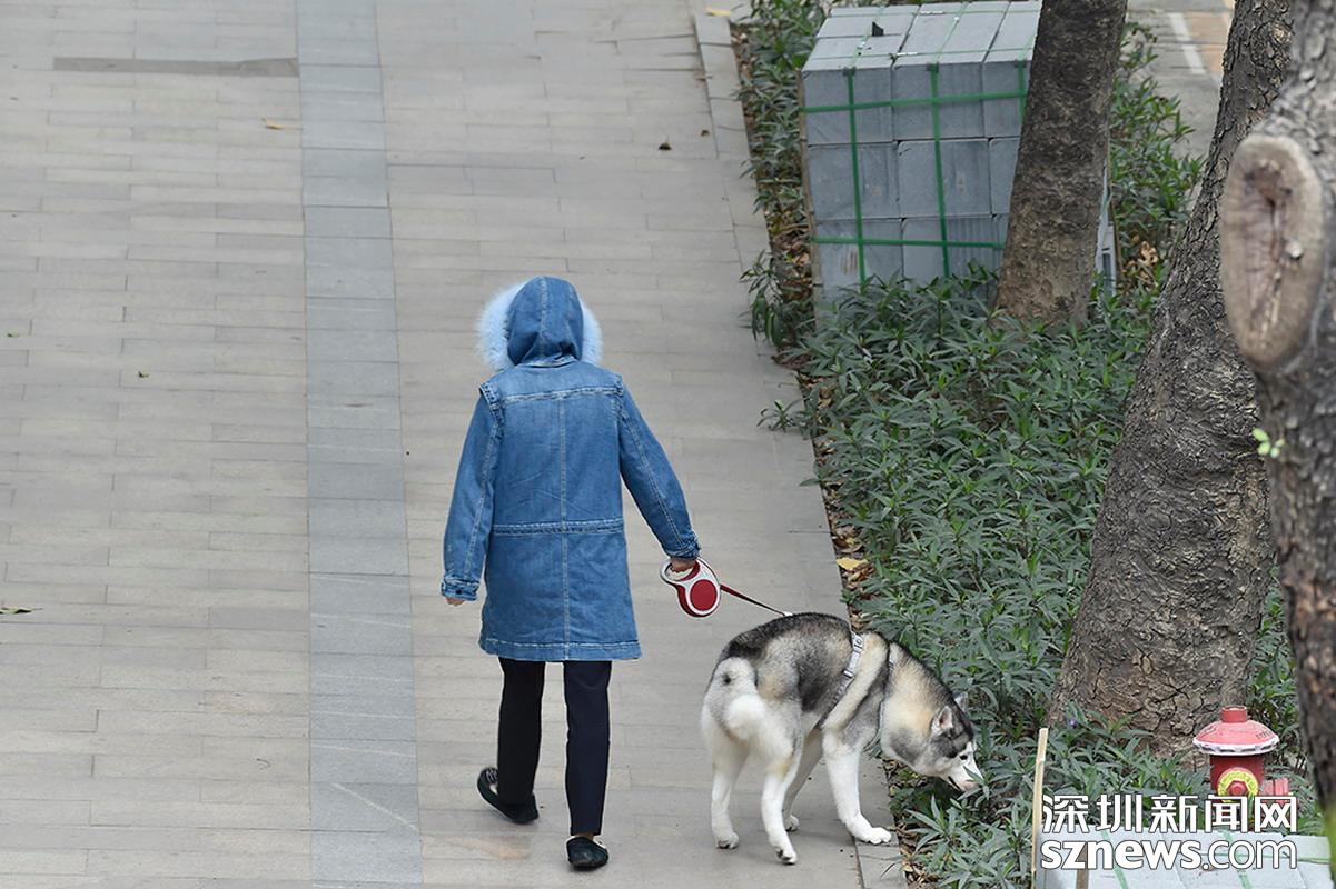 2018年12月12日,羅湖翠竹天橋附近,市民穿著冬裝遛狗。