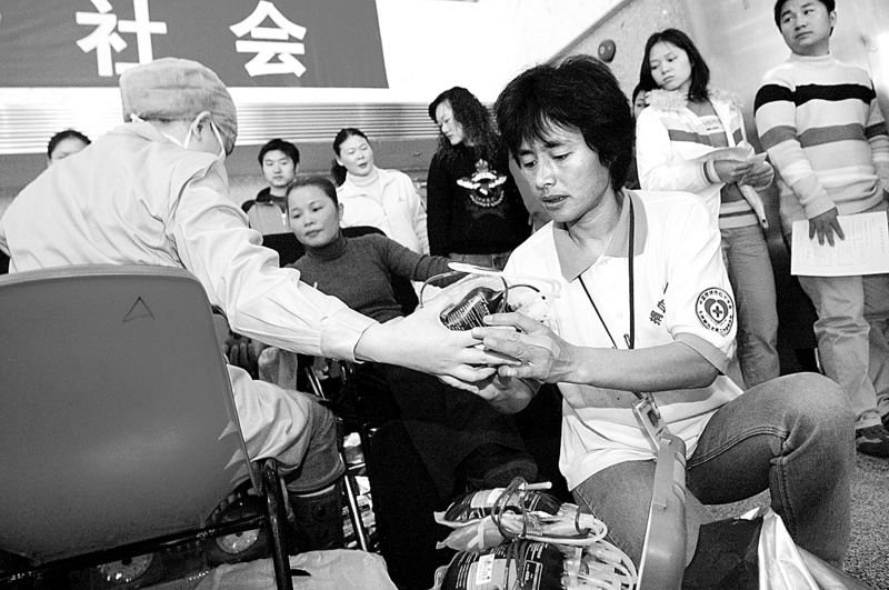 2006年,深圳獻(xiàn)血女狀元、獻(xiàn)血義工服務(wù)隊(duì)副隊(duì)長(zhǎng)高敏在捐血現(xiàn)場(chǎng)協(xié)助醫(yī)生工作。許業(yè)周攝