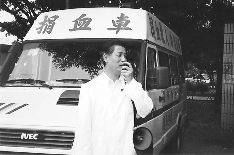 1995年5月7日,捐血車第一天開上街頭,血站老站長(zhǎng)楊春森拿著擴(kuò)音器大嗽叭向市民宣傳。余海蓉?cái)z
