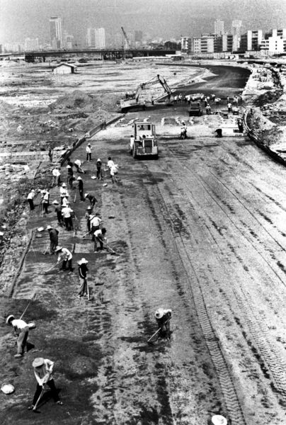 1994年修建濱海大道時(shí)泥頭車(chē)運(yùn)泥填海。鄭東升攝