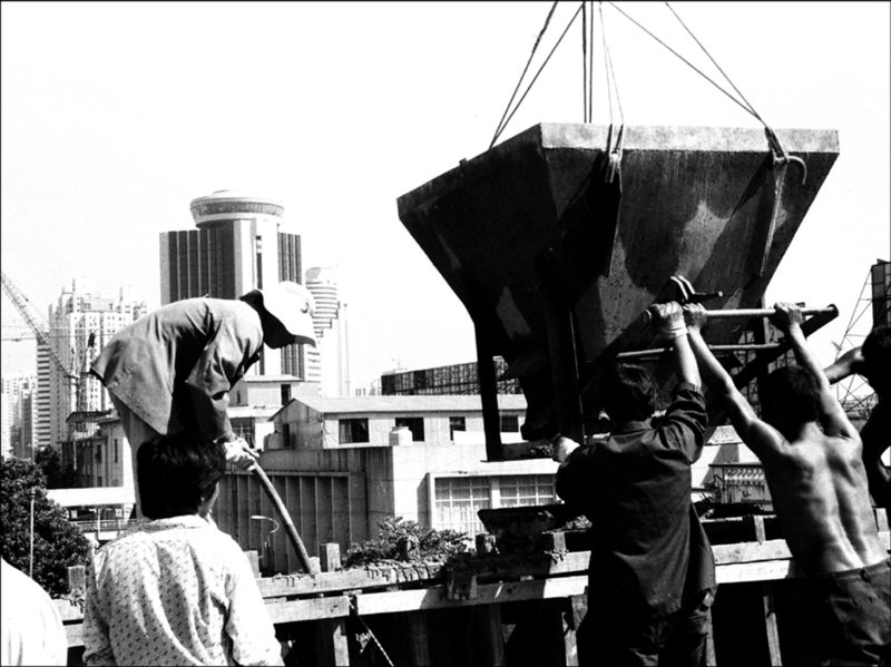 1993年5月,中心區(qū)“四橋一廣場(chǎng)”工程施工進(jìn)入最后沖刺,圖為建設(shè)者們?cè)谶M(jìn)行路面石粉平整施工的情景。馬樹(shù)華攝