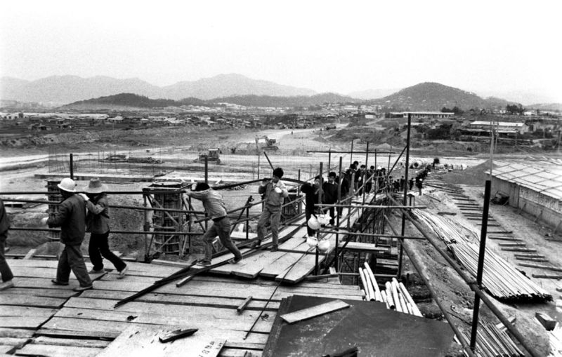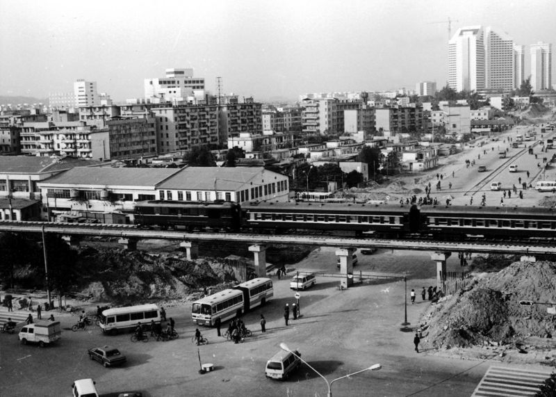 1985年,建設(shè)者們?cè)谏钲诨疖?chē)站人行天橋施工。呂翔攝