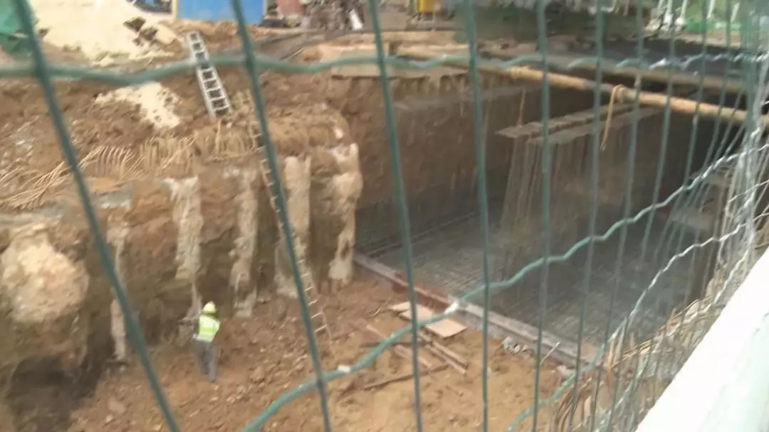 今天記者在現(xiàn)場看見,施工工地為河流拐道的箱涵工程,工地現(xiàn)場高度落差有近10米,目前箱涵只安裝了前期的部分頂板。