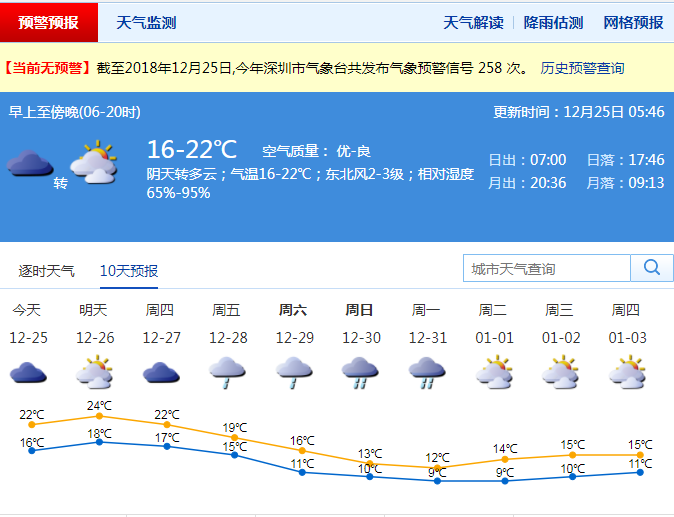 深圳新聞網2018年12月25日訊 連日來,受弱冷空氣南下活動影響,與前期上空的暖濕氣流相遇,導致鵬城陰天并伴有小雨天氣,氣溫下降3℃-4℃。24日早晨最低氣溫普遍在14℃,天氣陰涼。市氣象臺預測,未來三天轉多云天氣,氣溫回升,最高氣溫可達24℃。