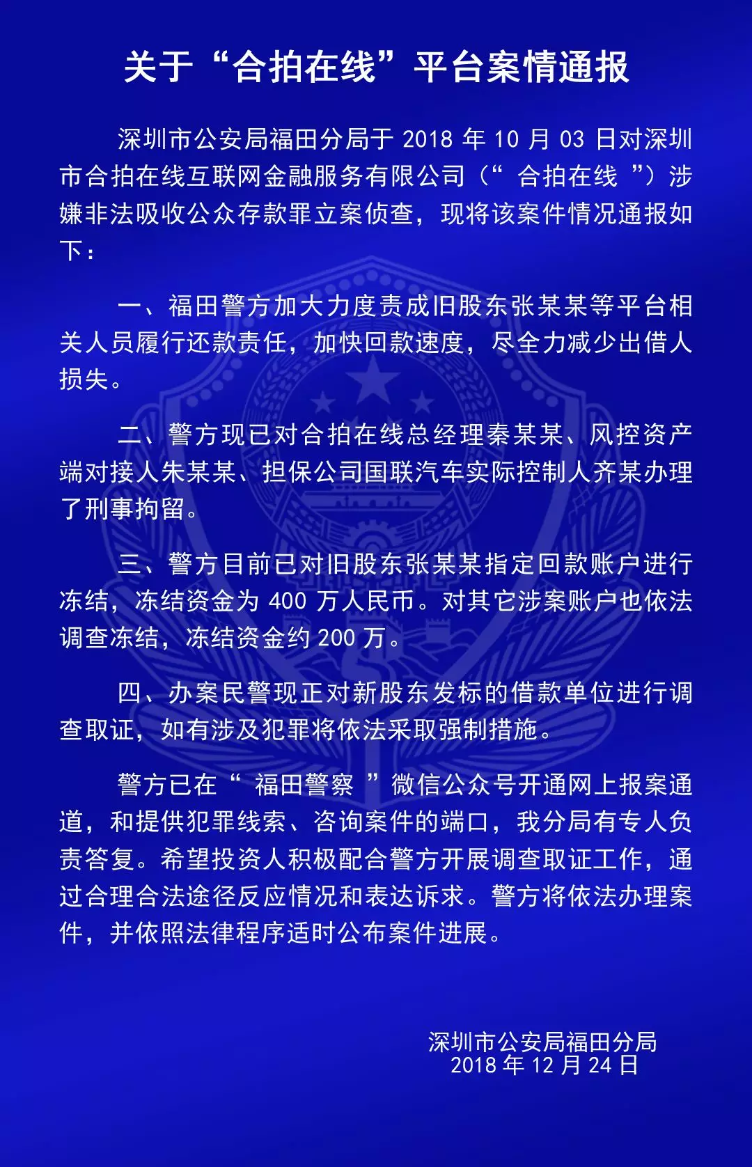關于“合拍在線”“壹佰金融”“五星財富”“眾車在線”“財富中國”“小零錢”“錢爸爸”“合時代”和“前金融”平臺的案情通報