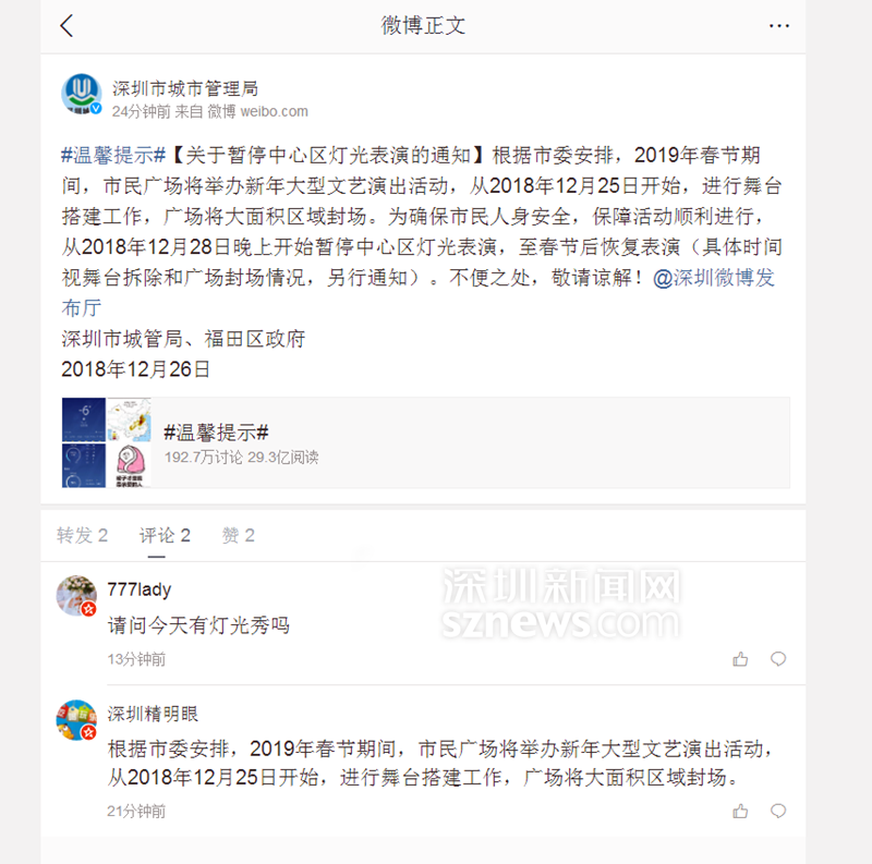 深圳燈光秀12月28日起暫停表演 春節(jié)后再恢復(fù)