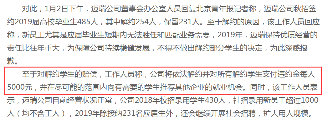 2019年1月2日,邁瑞負(fù)責(zé)人回應(yīng):秋招簽約485人中解約254人,會(huì)支付違約金