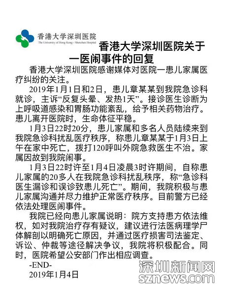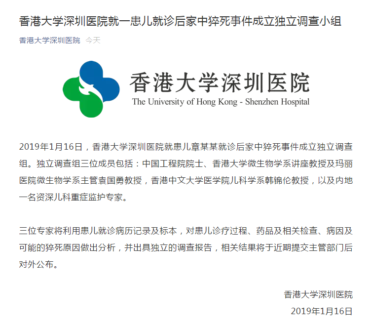 1月16日,香港大學(xué)深圳醫(yī)院就患兒章某某就診后家中猝死事件成立獨(dú)立調(diào)查組,待調(diào)查完畢后將把相關(guān)結(jié)果提交主管部門并對外公布。