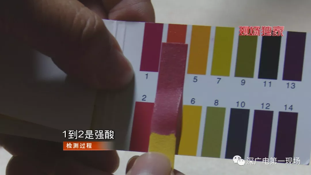 記者在地面上提取了一些廢棄液體,經(jīng)過PH試紙檢測,酸性數(shù)值在1到2之間。也就是說,這些液體呈強酸性。