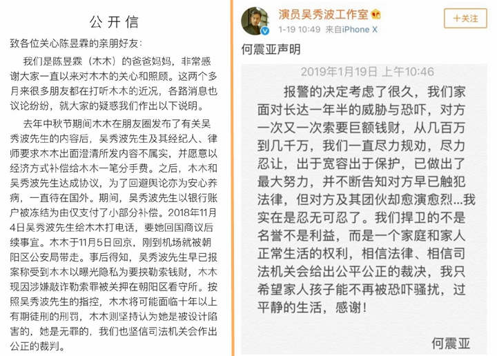 深圳新聞網(wǎng)1月22日訊(記者 張玲)近日,演員吳秀波婚內(nèi)出軌事件再度發(fā)酵在微博引發(fā)熱搜,而這次事件的主角則是之前銷聲匿跡已久的陳昱霖(藝名)。2019年1月18日,陳昱霖父母微博公開發(fā)表聲明稱女兒被吳秀波欺騙回國后,吳秀波以“曝光隱私威脅勒索錢財”為由報警,女兒在下飛機后即被警方抓捕。隨后,吳秀波妻子何震亞發(fā)表聲明反擊,稱陳昱霖多次威脅索要巨額財務(wù),數(shù)額一度高達千萬,在忍無可忍的情況下才選擇報警,希望通過司法途徑維護自己的權(quán)益。