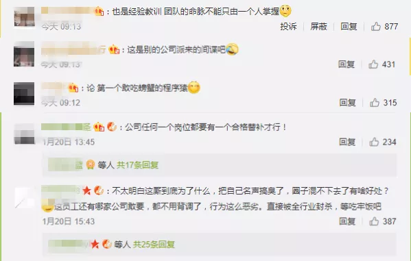 1月20日,深圳市螃蟹網(wǎng)絡(luò)科技有限公司創(chuàng)始人尹柏霖發(fā)文控訴,前員工燕某在游戲上線測(cè)試當(dāng)天(2017年12月15日),鎖死服務(wù)器與電腦,并惡意失蹤,致公司損失慘重。尹柏霖稱,“我們上線不了也測(cè)試不了,等新員工到職后熟悉新代碼又是幾個(gè)月過(guò)去了。”
