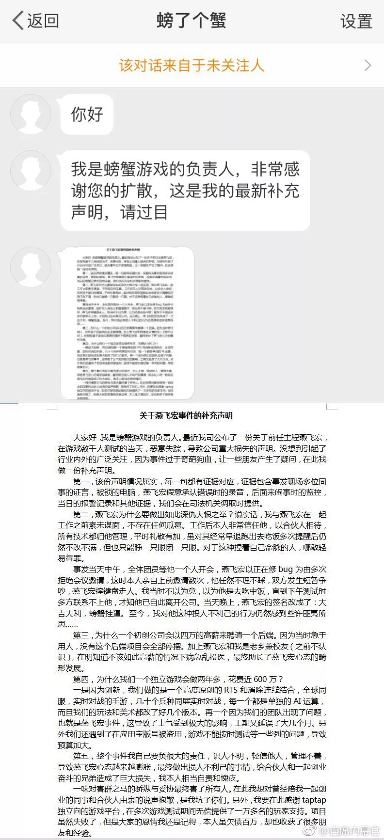 該微博一同曝光的還有一份“關(guān)于燕飛宏的補(bǔ)充聲明”,自稱是螃蟹游戲負(fù)責(zé)人的“螃了個(gè)蟹”表示,自己與燕飛宏在一起工作之前素未謀面,不存在任何瓜葛,工作后非常信任他,以合伙人相待,所有技術(shù)都?xì)w他管理,因?yàn)槟笾久},對(duì)其經(jīng)常早退也只能睜一只眼閉一只眼。