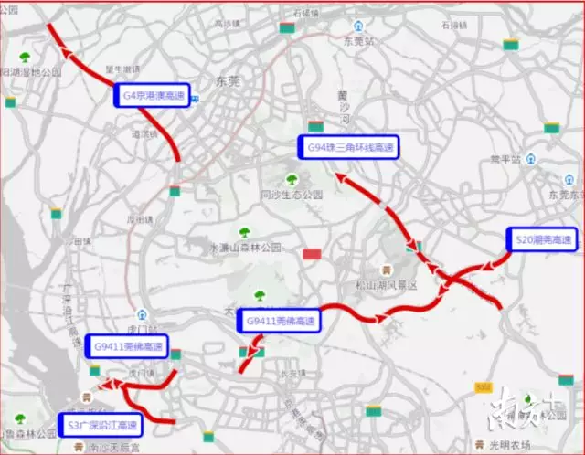 建議途經(jīng)廣深高速公路由深圳往廣州方向(北行)的車輛,在北行長安出口、虎門出口繞行國道或轉到?;⒏咚俟返綇V州。