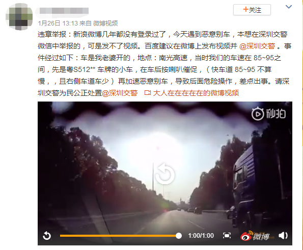 近日,有網(wǎng)友在微博爆料稱自己的車在高速上遇到惡意別車,并 @深圳交警,爆料原文如下。