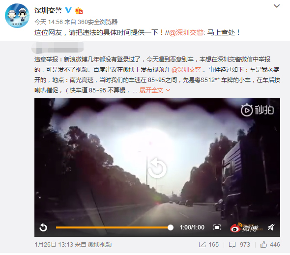 1月28日下午3點,深圳交警在微博回復(fù)該網(wǎng)友稱馬上查處,并希望爆料博主能提供具體的時間。