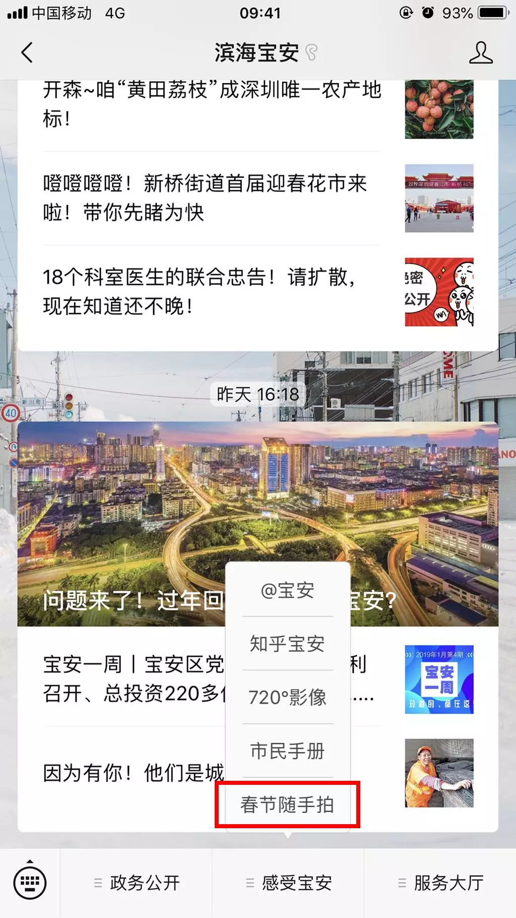 1、掃碼關注“濱海寶安”微信公眾號,在下方菜單欄中點擊“春節(jié)隨手拍”參與活動。